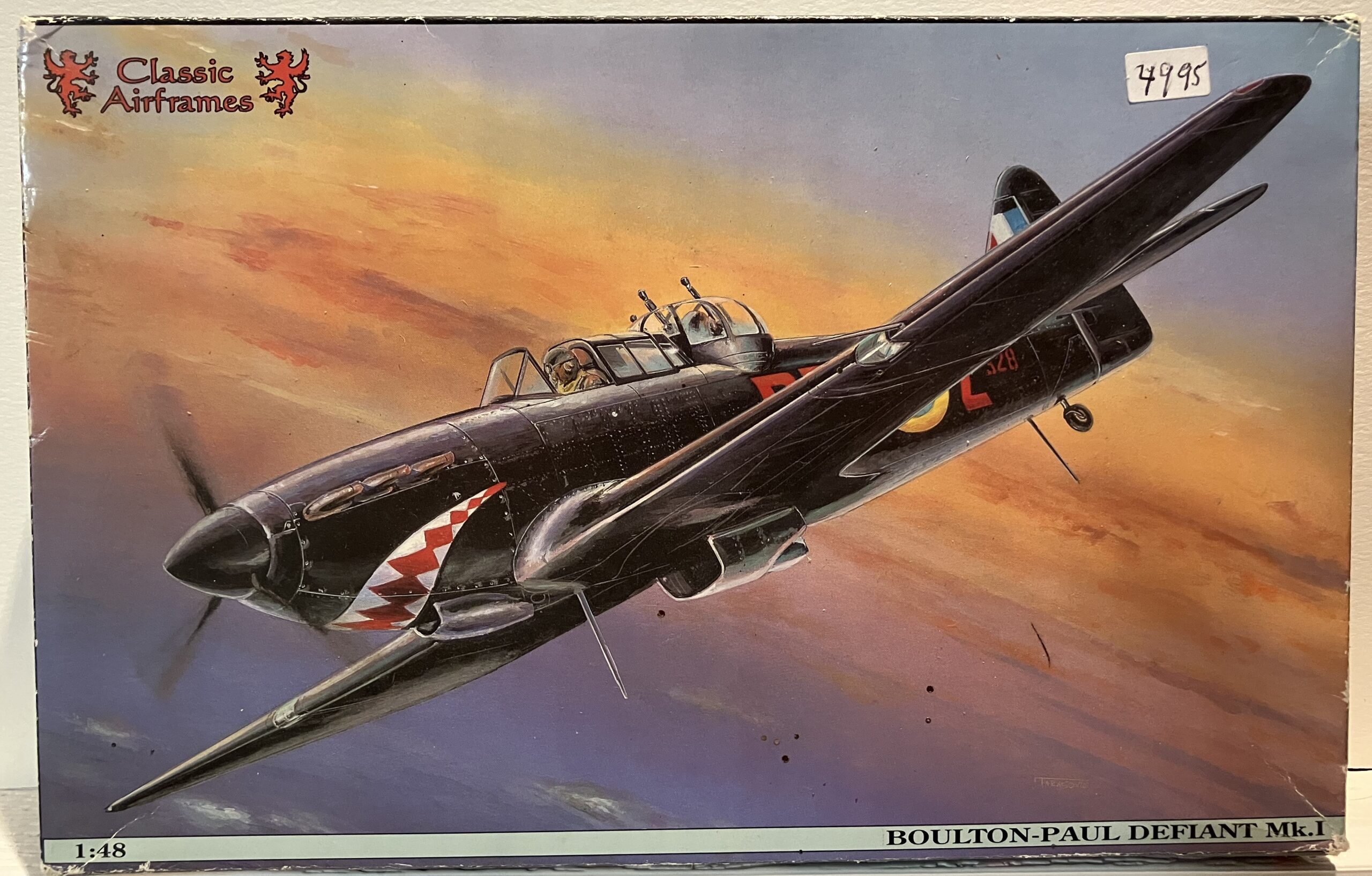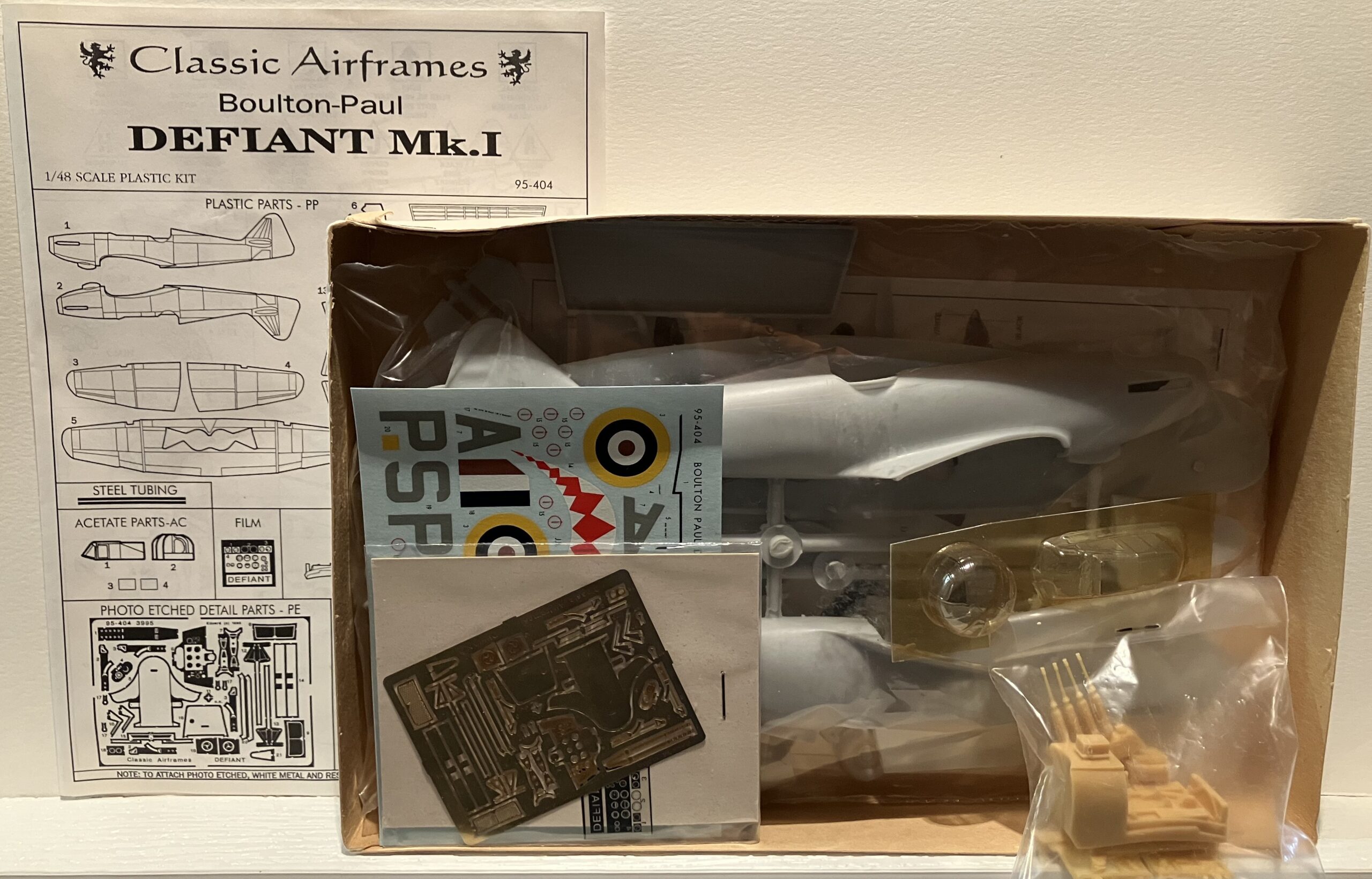 This 1/48 Classic Airframes Defiant is from 1995 and might be considered to be short run. The parts are in a sealed bag. They have no locating pins and the sprue connectors especially at the wings are quite large. Despite those points a nice resin cockpit is included a with a large PE fret, some metal tubes for landing gear and a nice Propagteam decals sheet with two schemes. With older decals a test to ensure they will work is advised. The canopy is acetate and a bit yellowed so some time in a sunny window may help to clear that up. This kit is from my own collection of night fighter models.