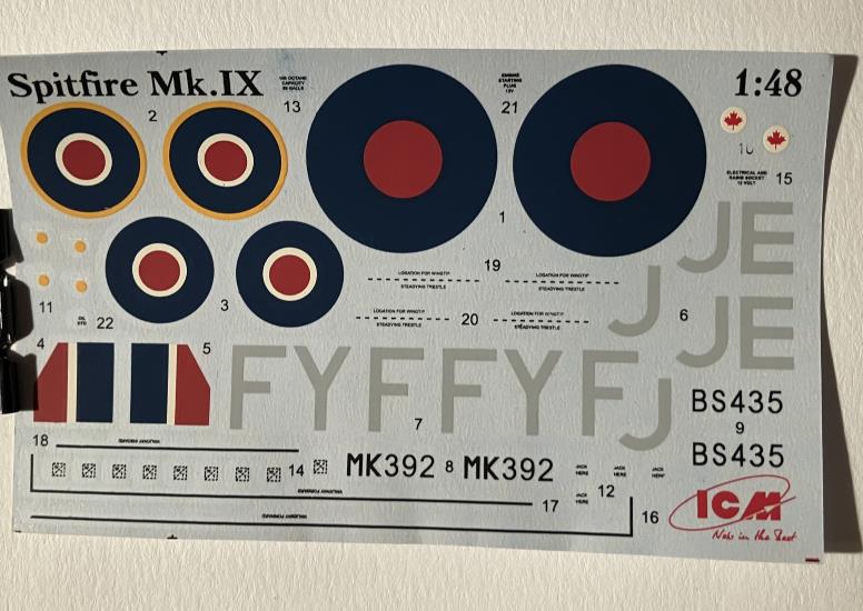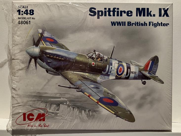 1/48 ICM Spitfire Mk IX #48061 is a 2012 rebox of a 2001 tooling. The box is open and the bag sealed. These kits have full engine, cockpit, a selection of weapons and a slipper tank and a variety of wing tips and cannon blisters. This is a complex kit requiring some care to build. Decals for one of two aircraft.